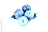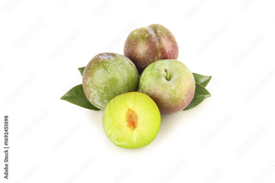 Fresh Green Red Plums Cut Half Yellow Flesh Leaves White Background Organic Stone Fruit