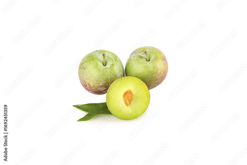Fresh Green Plums with Cut Half Showing Pit and Leaf on White Background