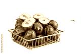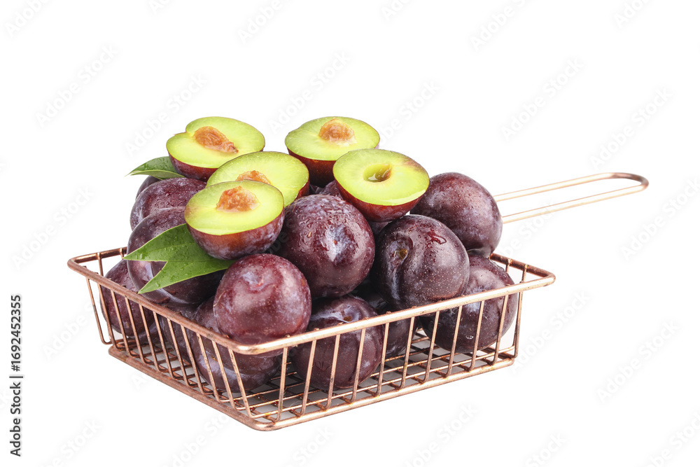 Fresh Purple Plums in Copper Wire Basket Isolated on White Background