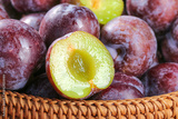 Fresh Red and Green Plums in Wooden Basket - Ripe Stone Fruit with Cut Half Showing Juicy Interior