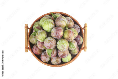 Fresh Premium Plums in Wicker Basket on White Background - Colorful Stone Fruit Harvest
