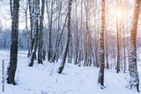 Sunbeams shining through snow-covered birch branches in a birch forest after a snowfall on a winter.
