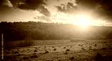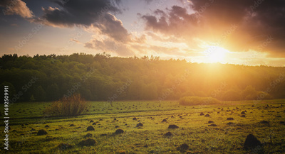 Peaceful meadow landscape with golden sunset creates serene mood. Idyllic rural scene for posters, calendars, nature themes and backgrounds. Vintage film asthetic.