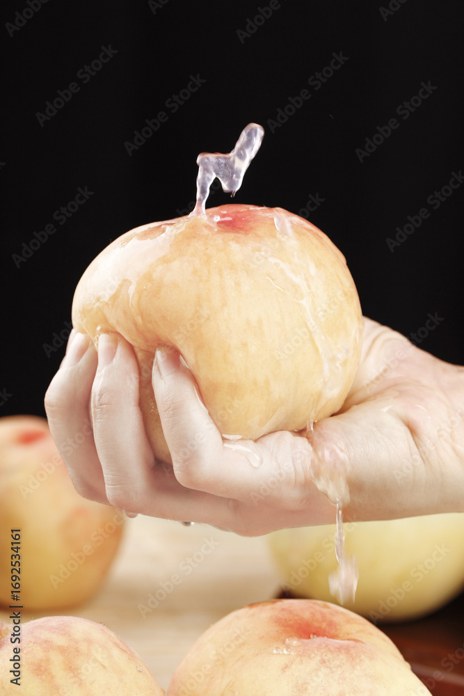 Hand peeling fresh juicy Yangshan Wuxi peach with dripping juice on black background