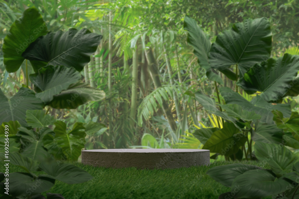 minimal concrete podium table top with outdoors in tropical forest nature background.natural product pedestal modern stand display,jungle paradise concept.