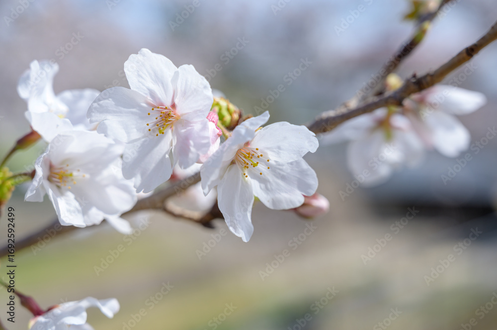 Cherry blossoms in Japan. Beautiful, delicate white petals of the Sakura branch in spring.