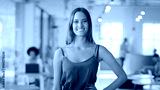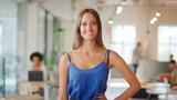 Portrait Of Young Smiling Businesswoman Standing In Busy Modern Open Plan Office