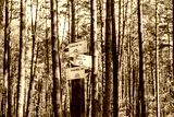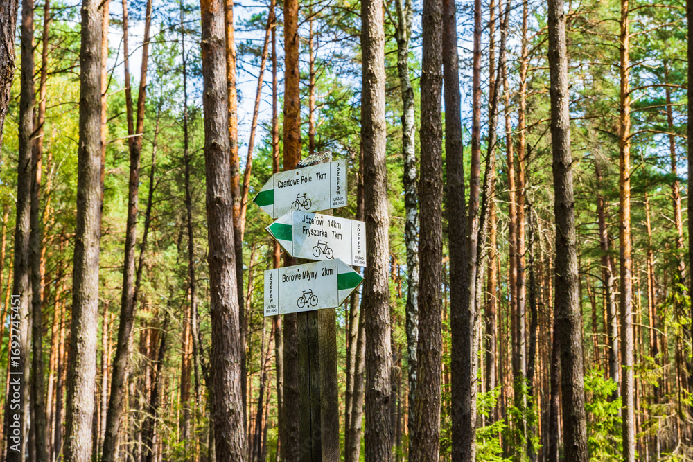 Cycling route signs on tree along forest road in Solska Wilderness, Roztocze region, Poland