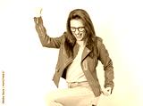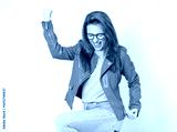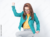 Excited beautiful young woman with closed eyes and clenched fists, wearing green leather jacket, isolated on white background. Yes concept. Good news
