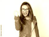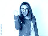 Angry girl looking at camera and shows fist, wearing green leather jacket, isolated on white background. Frustrated woman