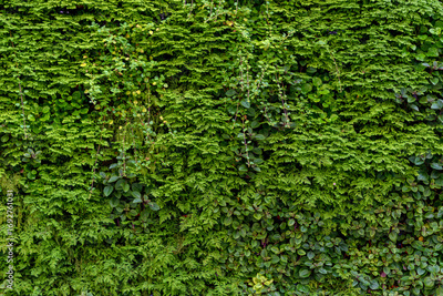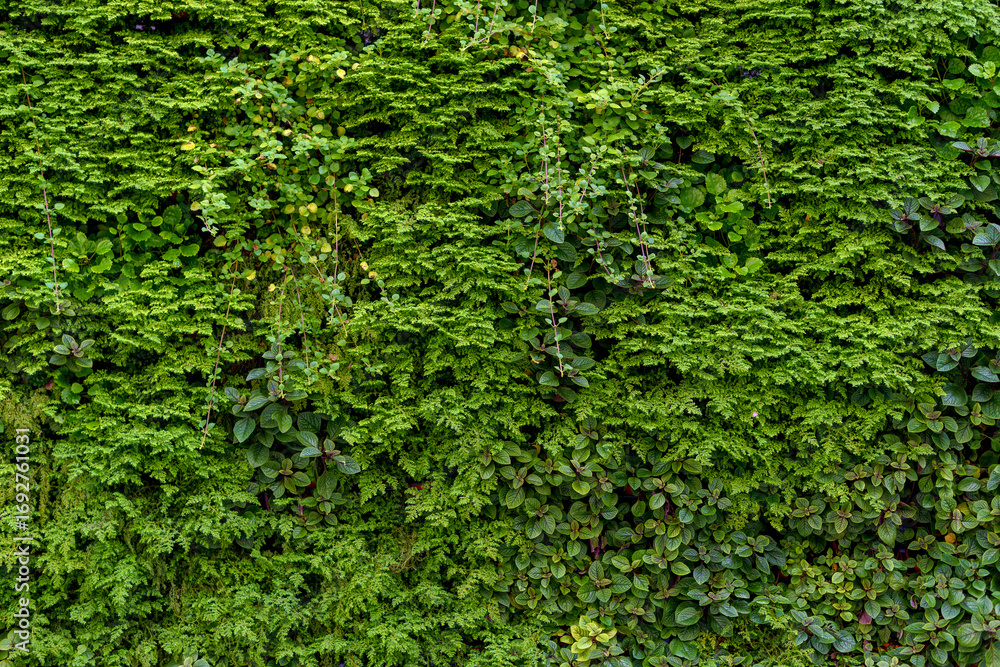 A dense array of living plants creates a vivid green surface with diverse foliage. The scene conveys the vitality of nature and the decorative richness of a botanical setting.