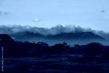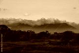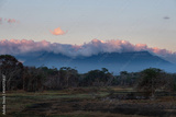 A remote view of the Gran Sabana in Venezuela. Majestic tepui mountains are shrouded in clouds at sunset, creating a serene and mystical wilderness landscape