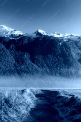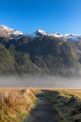 Scenery in South Island, New Zealand near Te Anau, with the snow capped Southern Alps and unpaved pathway into pasture lands and low lying fog