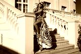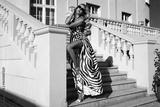 Elegant woman in zebra print maxi dress posing on luxury stone stairs outdoors in summer, fashion model wearing sunglasses and stylish dress