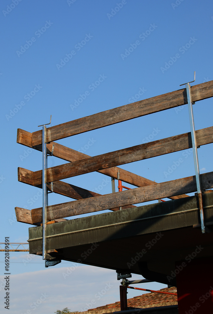 barrier with wooden planks firmly installed on the roof for protection of workers to avoid falls during the roof repair work of condominium without people