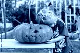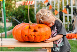 Little girl is getting ready for Halloween, decorating the garden with pumpkins and a skeleton