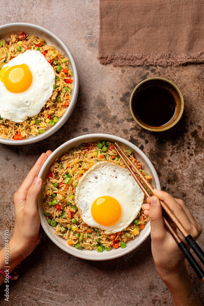 Girl Eating Fried egg on rice with vegetables, green peas, bell pepper, carrot and zucchini, served with soy sauce, chopstick. Top view, brown table surface.