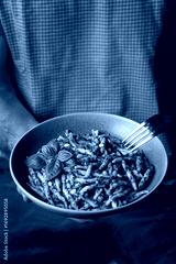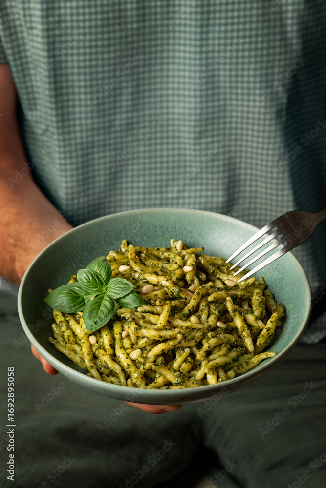 Man eating Trofie al pesto, italian pasta with homemade pesto genovese, made with basil leaves, olive oil, parmesan, pecorino, pine nuts, and garlic. Vertical image.