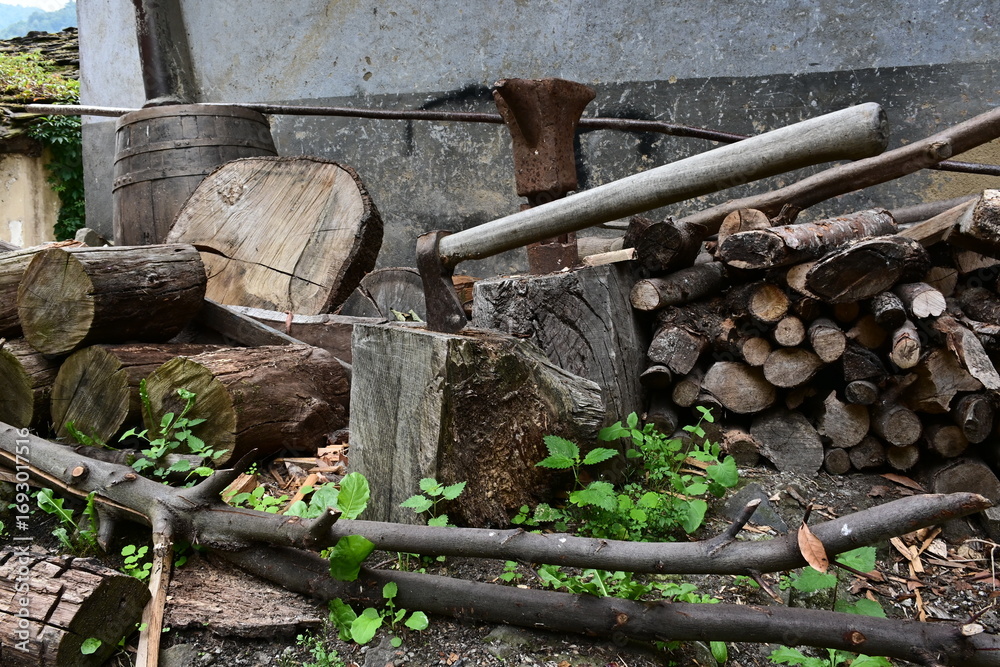 un hacha clavado en un tronco