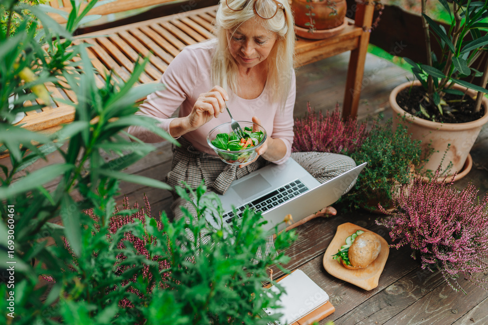 Older woman having lunch while working from homeoffice.