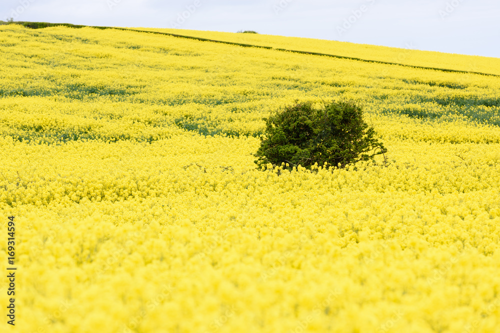 Hawthorn trees in a field of rape with their yellow flowers in a field.