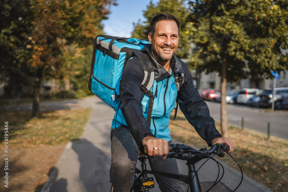 Delivery man riding bicycle smiling carrying insulated backpack in city park