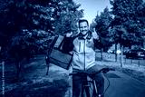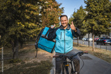 Deliveryman gesturing thumbs up while delivering food with bicycle in city