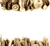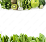 Green smoothie with apples, parsley, spinach, cucumber and kiwi on a white background. Top view. Spinach smoothie and vegetables at border of image with copy space for text. Fruit on white background.