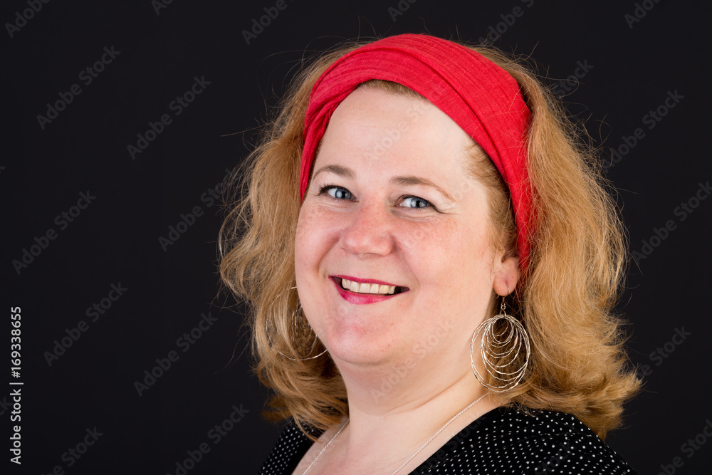 Portrait of a attractive european light overweighted red haired female in dark shirt, headshot, in front of black backgrouind
