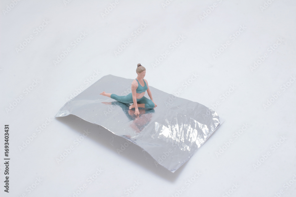 Miniature Figure Practicing Yoga on Metallic Surface in a Studio Setup