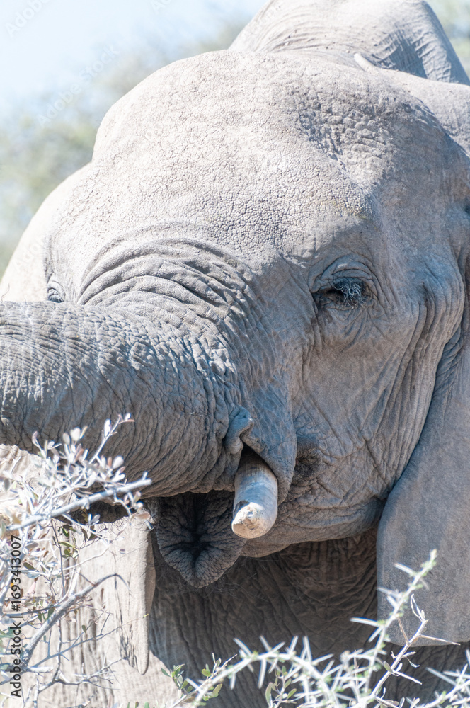 Extreme closeup of one giant African Elephant -Loxodonta Africana- grazing on the plains of Etosha National Park, Namibia.