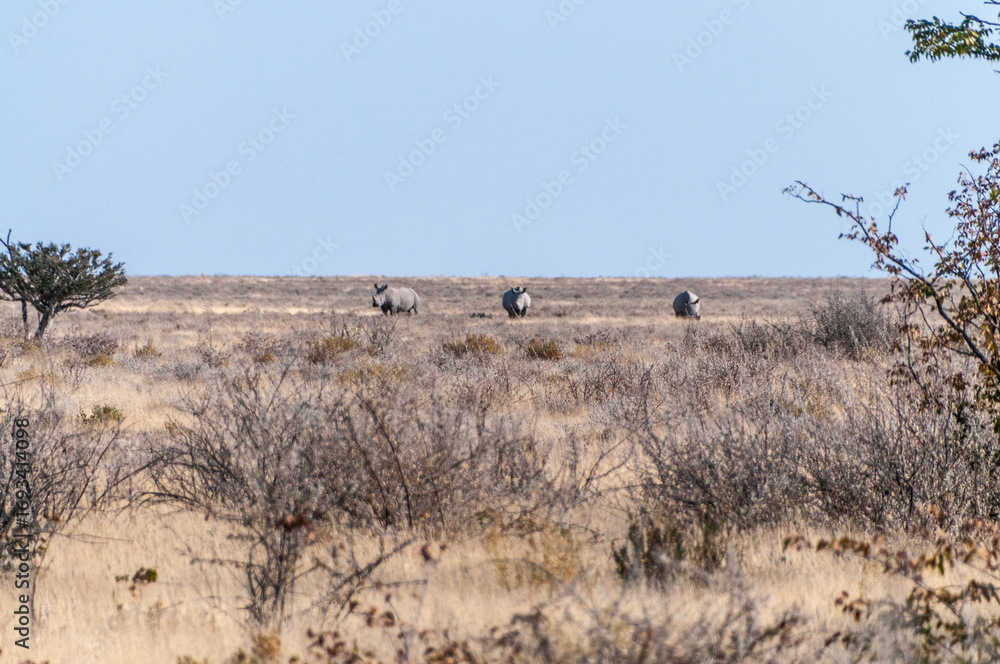 Telephoto of a herd of white Rhinos -Ceratotherium simum- on the plains of Etosha national park, Namibia.