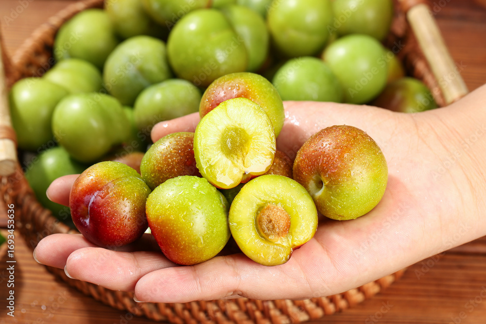 Farmer holding fresh cut plums showing red and green fruit pulp with basket harvest