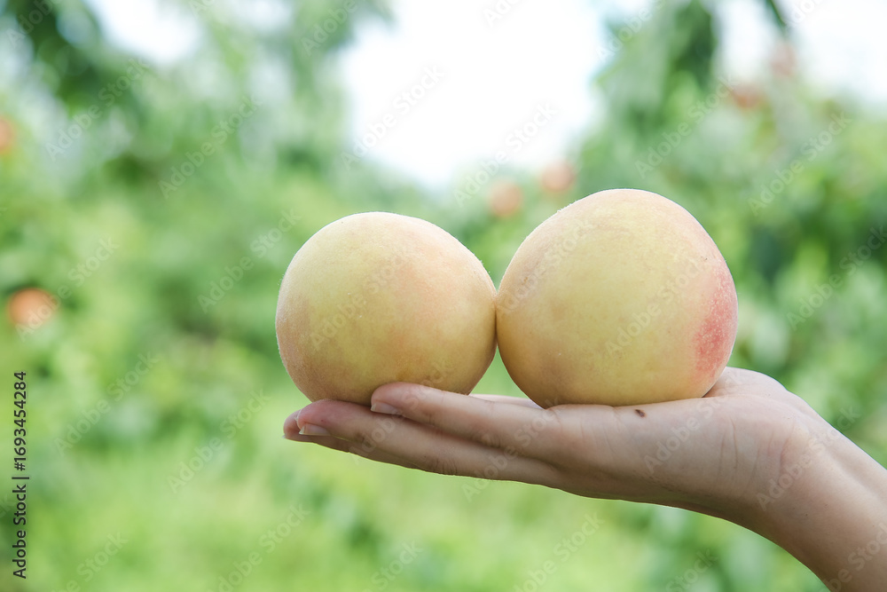 Farmer holding fresh Yangshan peaches in orchard - organic fruit harvest concept