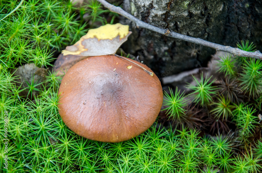 Mushroom in the light green forest. Autumn. Dry leaves, moss background.