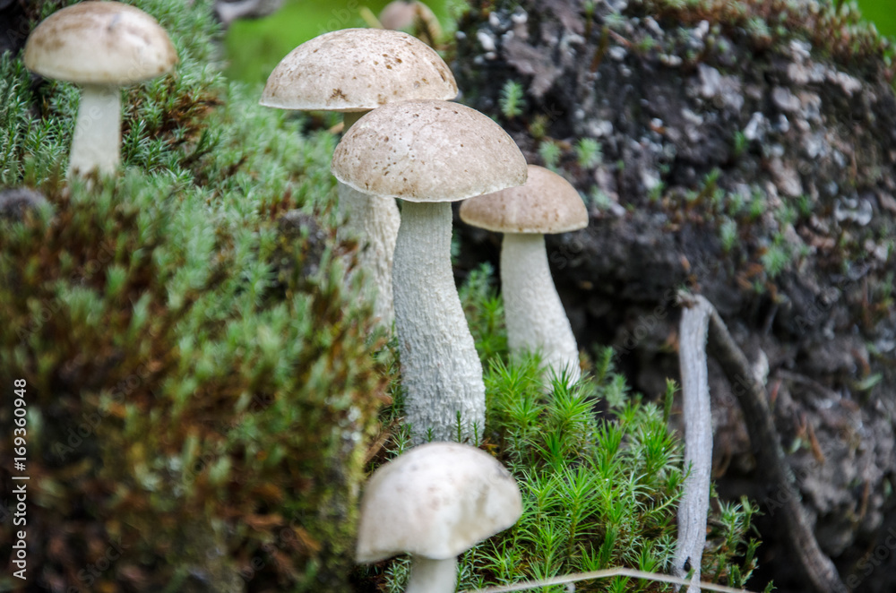 Mushroom in the light green forest. Autumn. Dry leaves, moss background.