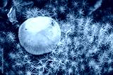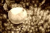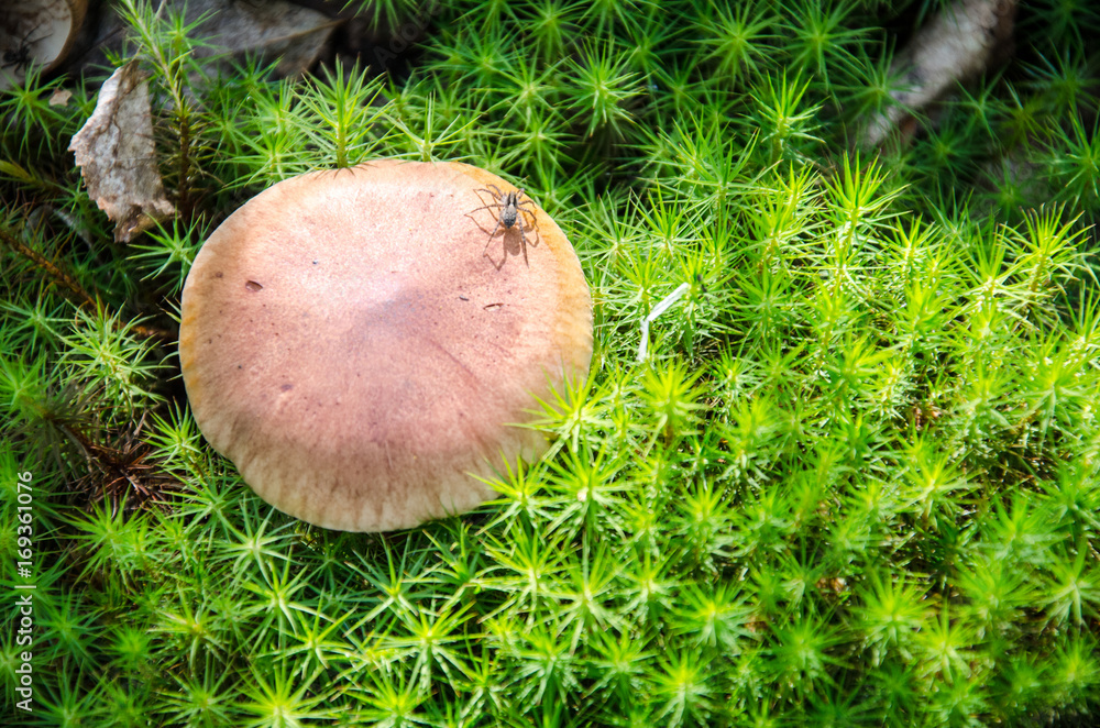 Mushroom in the light green forest. Autumn. Dry leaves, moss background.