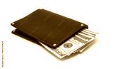 Purse with money on white background