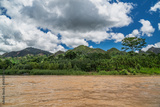 Heavy rain over the Amazon River and forest, with a small boat navigating the water amidst the storm