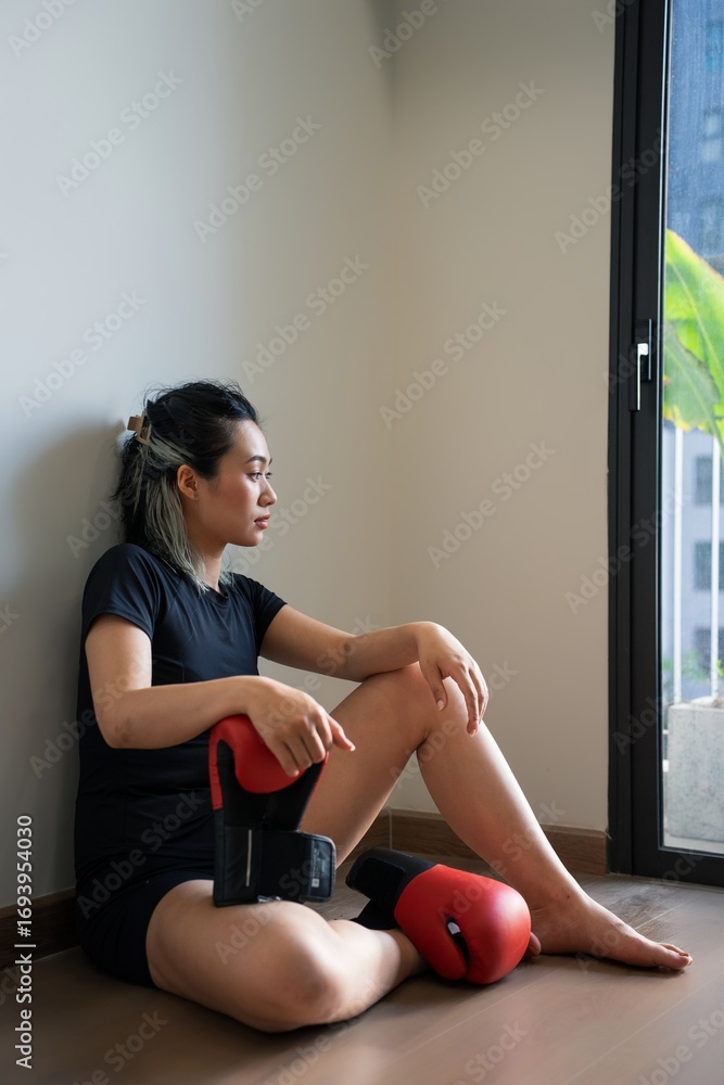 Female athlete relaxing after workout in modern urban home with red boxing gloves