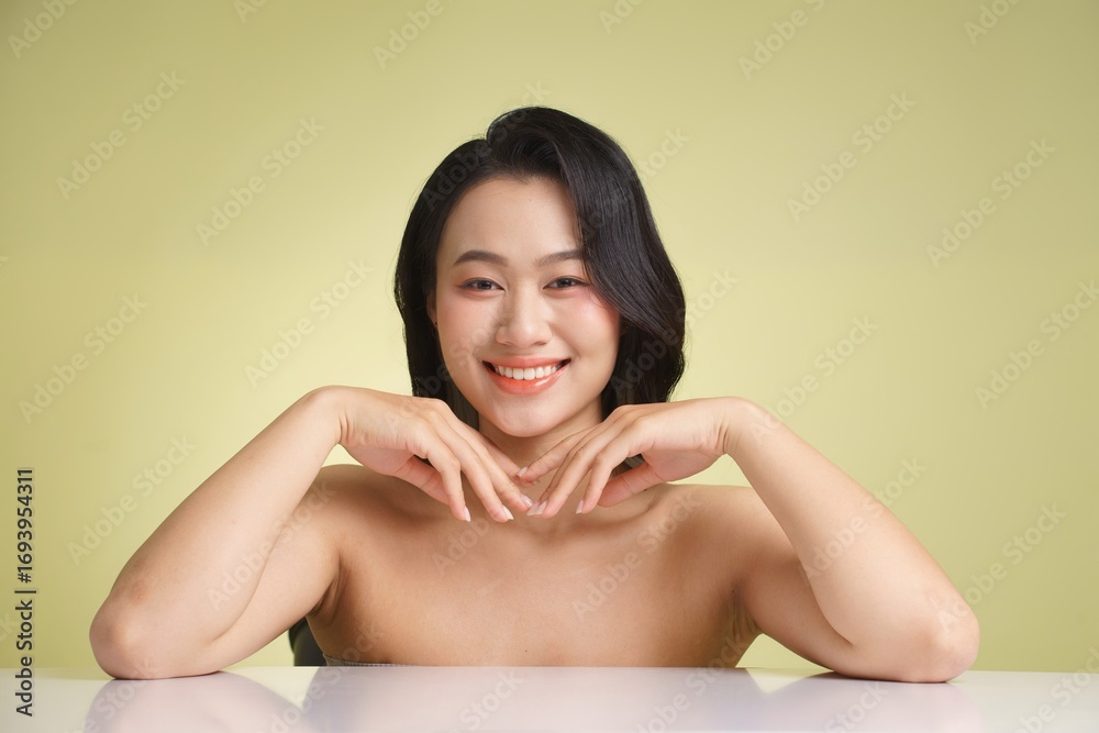 Smiling young woman poses gracefully with hands on chin against a light background