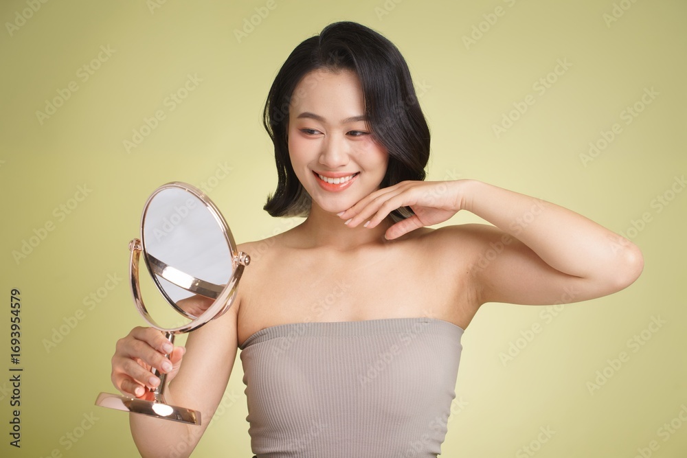 Young Asian woman admiring her reflection in a handheld mirror with a cheerful expression in a brightly lit room
