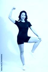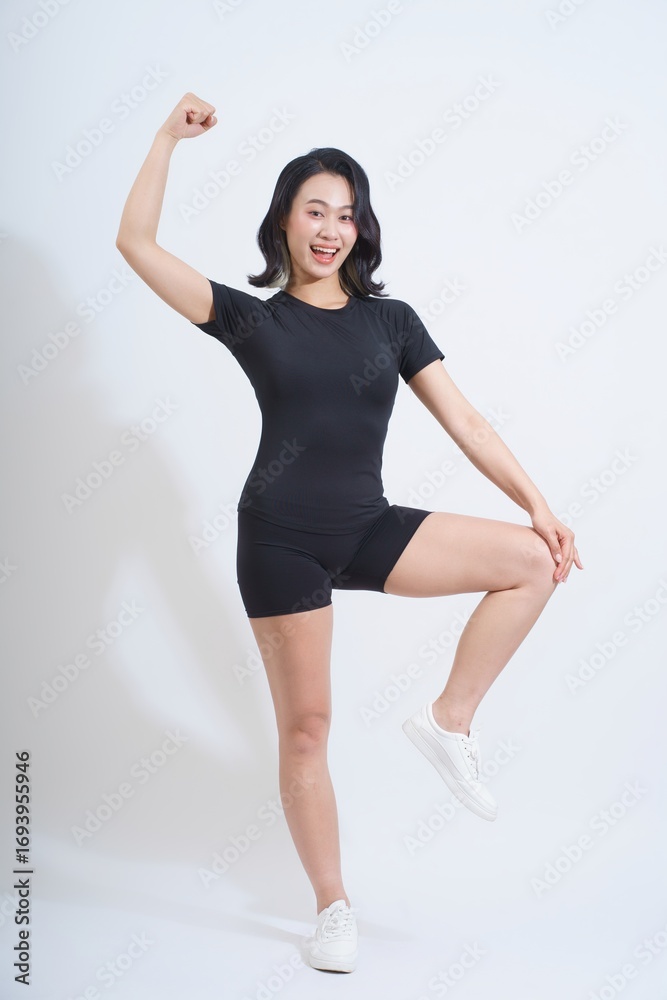 Dynamic Asian woman expressing joy and confidence in athletic attire against a plain background