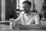 Ginger bearded man scrolling smartphone while sitting at cafe table