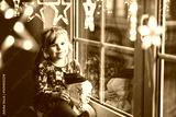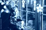 Little preschool girl holding cup Santa Claus boot with gift called Nikolausstiefel in German. Happy child wait on holiday by window with Christmas lights in winter. Cozy family celebration of xmas.