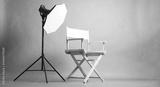 A white director chair and studio lighting setup on green screen background