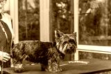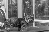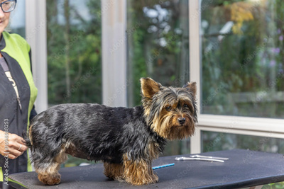 Yorkshire terrier. is ready for grooming standing on the table. Horizontally.