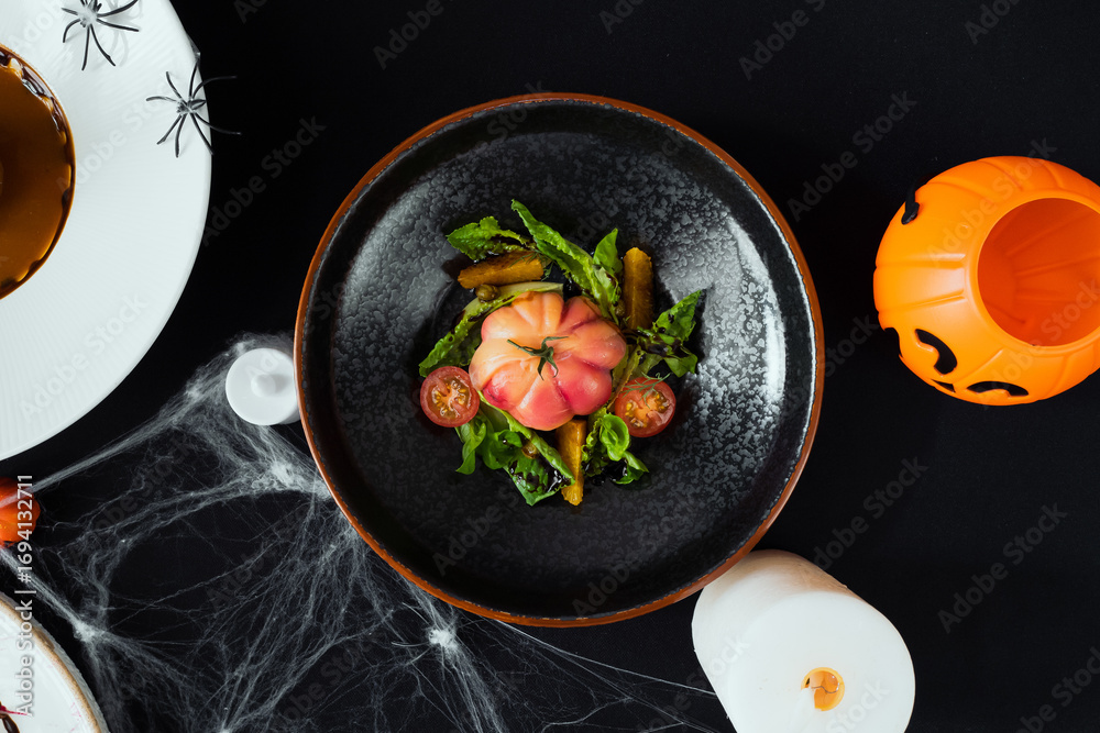 Halloween Culinary Delights: An elegant arrangement of fresh seasonal cuisine on a dark plate, artistically set for the spooky holiday, incorporating elements of spiderwebs and festive decor