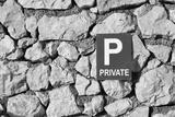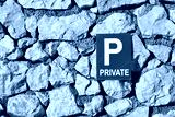 A blue and white private parking sign is mounted on a traditional stone wall, creating a contrast of man-made and natural elements