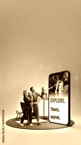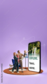 Family pointing at smartphone with inspiring waterfall travel screen. Concept of online booking, inspirational travel ads, family blogs, and insurance services in journeys. 3D island composition